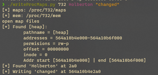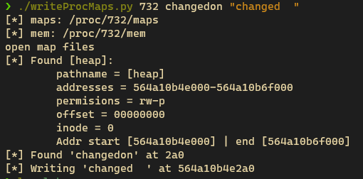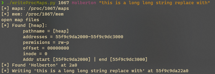 这意味着我们可以通过/proc/[pid]/mem文件定位到运行中程序的堆空间。如果我们可以从堆中读取,就可以定位到想要修改的字符串。如果我们可以写堆,就可以用我们想要的替换这个字符串。