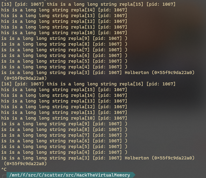 继续之前,思考一下,根据我们前面关于虚拟内存的描述,你认为这个新的字符串副本会位于什么位置?高地址还是低地址?